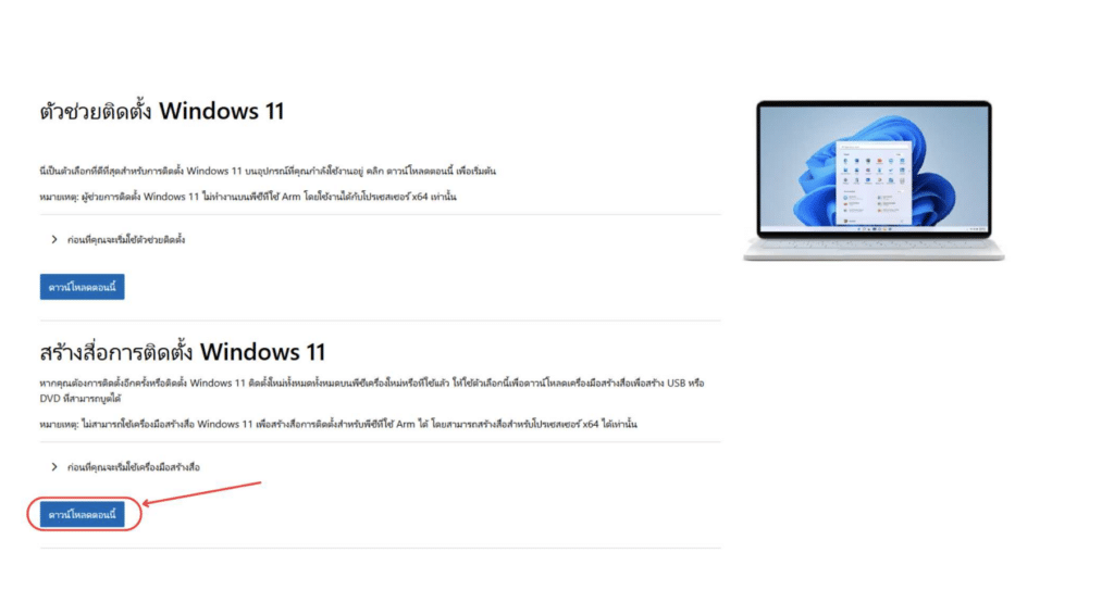 ขั้นตอนที่ 1 เข้าไปที่เว็บ https://www.microsoft.com/th-th/software-download/windows11 คลิกดาวน์ “โหลดสร้างสื่อการติดตั้ง Windows 11”