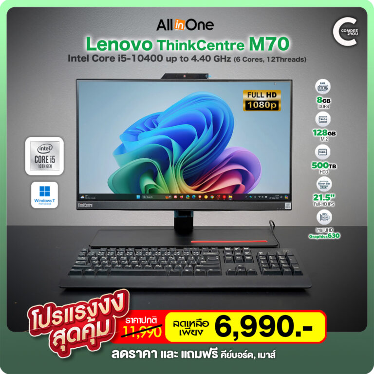 (All in one) Lenovo ThinkCentre M70 | 21.5″ FHD IPS | Core i5-10400 | RAM 8GB DDR4 | 128GB NVMe + HDD 500GB | Windows 11Pro | มือสอง